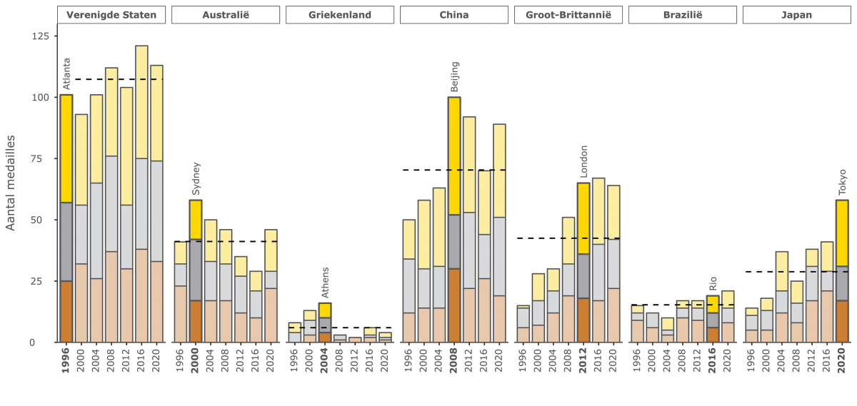 Zullen de Franse atleten daarom meer medailles winnen dan op de vorige Spelen? In Tokyo 2020 wonnen ze 33 medailles, waarvan 10 gouden. Toen heerste de COVID-19 pandemie, waren er geen toeschouwers en werd elke wedstrijd in stilte gespeeld. Desondanks leek Japan nog steeds een thuisvoordeel te hebben, niet anders dan de landen die eerder als gastheer waren opgetreden. In het jaar waarin een land de Olympische Zomerspelen organiseerde (dikke balk), deed dat land het beter dan normaal (stippellijn).