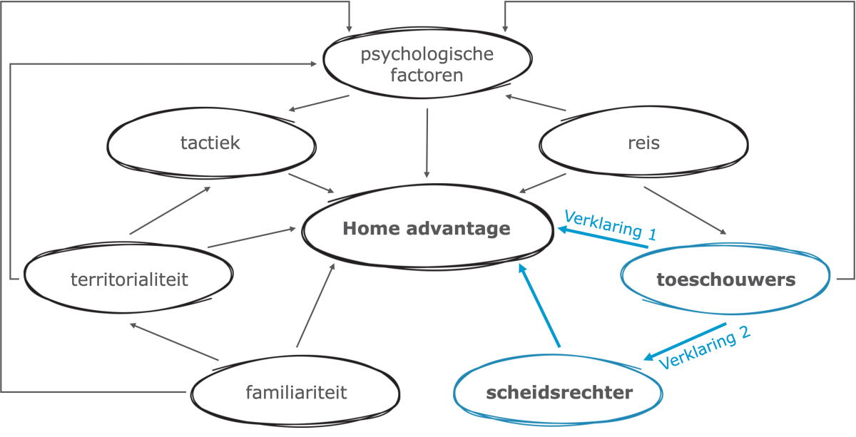 Figuur 2. Model thuisvoordeel. (bron: aangepast van Pollard, R., & Pollard, G. (2005). Thuisvoordeel in voetbal: Een overzicht van het bestaan en de oorzaken. Internationaal Tijdschrift voor Voetbal en Wetenschap, 3(1), 25-33.)
